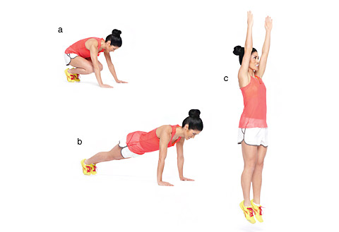Ξεκινήστε με λυγισμένα γόνατα, όπως φαίνεται στη φωτογραφία, τεντώστε τα πίσω, φέρτε τα ξανά μπροστά στο στήθος λυγισμένα και μετά σηκωθείτε και κάντε άλμα. Επιστρέψτε στην αρχική θέση και επαναλάβετε για συνολικά 2 λεπτά.