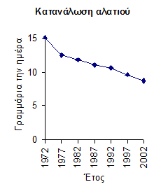 Στις μέρες μας όμως η συνηθισμένη κατανάλωση Νατρίου σε μια δίαιτα 2100 θερμίδων κυμαίνεται στα 3000-4500mg (7,5-11,25g σε αλάτι), ενώ την ίδια στιγμή η κατανάλωση του Καλίου είναι περίπου 1750mg, του Ασβεστίου 440mg και του Μαγνησίου 180mg, όλες πολύ μικρότερες από τις συνιστώμενες.