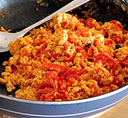Συγχρόνως σπάμε τα αυγά σε ένα βαθύ μπολ και προσθέτουμε ελάχιστο γάλα ή νερό (ένα κουτ. γλυκού περίπου). Χτυπάμε το μείγμα έτσι ώστε να φουσκώσει. Συγχρόνως το λάδι έχει κάψει, οπότε ρίχνουμε τα αυγά στο τηγάνι και φροντίζουμε να ψηθούν καλά ανακατεύοντας με ένα πιρούνι ή ξύλινη κουτάλα. Μόλις ψηθεί-τηγανιστεί καλά τη σερβίρουμε και την απολαμβάνουμε.