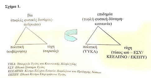 Με την επιδημία να τοποθετείται στην κορυφή του τριγώνου (ως τυφλή φυσική δύναμη), την τύχη να επιδρά στις υγειονομικές δομές και υπηρεσίες αλλά και στις πιθανές γενετικές τροποποιήσεις του ιού και την πολιτική να καλείται να λάβει δύσκολές αποφάσεις όπως για παράδειγμα η ασφάλεια και η αποτελεσματικότητα της χορήγησης των εμβολίων. (Σχήμα 1).