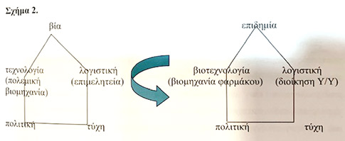 Καθώς μάλιστα νεότερες θεωρήσεις των απόψεων του Κλαούζεβιτς προτείνουν τη συμπερίληψη των παραμέτρων της τεχνολογίας και της λογιστικής και τον συνακόλουθο μετασχηματισμό της τριμερούς φύσης του πολέμου (Κουβελιώτης 2002) βλέπουμε πως και το τριγωνικό μοντέλο της στρατηγικής μας για την αντιμετώπιση των επιδημιών μπορεί να ακολουθήσει ανάλογους μετασχηματισμούς. Με την βιοτεχνολογία να ασκεί την επίδρασή της μέσα από τη φαρμακοβιομηχανία και την παρασκευή εμβολίων και αντι-ιικών φαρμάκων και τη λογιστική να εκφράζεται, στον χώρο της στρατηγικής καταπολέμησης των επιδημιών, μέσα από την οργάνωση των εμπλεκομένων Υπηρεσιών Υγείας και την αξιοποίηση και ορθή κατανομή των μέσων, των πόρων και των αποθεμάτων τους (Σχήμα 2).