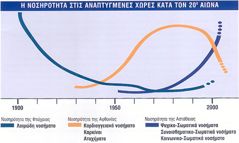 Στις ανεπτυγμένες χώρες του κόσμου, διαπιστώνεται ότι μεταβαίνουμε από τη νοσηρότητα της αφθονίας (καρδιαγγειακά νοσήματα, καρκίνοι, ατυχήματα) στη νοσηρότητα της αστάθειας. Αυτό σημαίνει ότι θα νοσούμε συχνότερα από ψυχικές, ψυχοσωματικές, συναισθηματικοσωματικές και κοινωνικοσωματικές παθήσεις, όπως η κατάθλιψη και οι νευρώσεις (πίνακας 1).