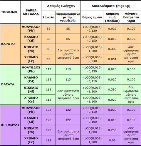 Στον παρακάτω Πίνακα 1 απεικονίζονται συνοπτικά τα αποτελέσματα του Προγράμματος Επισήμου Ελέγχου Βαρέων Μετάλλων σε καρότα, πατάτες και κρεμμύδια. Αναλυτικότερες πληροφορίες σχετικά με τα πρωτογενή στοιχεία ελέγχου, το πρακτικό της συνάντησης στις 26 Ιανουαρίου 2012 και της στατιστικής επεξεργασίας των αποτελεσμάτων μπορούν να αναζητηθούν στην ιστοσελίδα του ΕΦΕΤ (www.efet.gr).