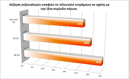 Μάλιστα, αξίζει να σημειωθεί ότι στους άνδρες ηλικίας 18 έως 34 ετών, δηλαδή, στους νέους άνδρες, που έχουν πληγεί περισσότερο από τις κοινωνικές και οικονομικές συνέπειες της κρίσης, οι σεξουαλικές επαφές το τελευταίο τετράμηνο έχουν αυξηθεί κατά 35%. Ακολουθούν, πολύ κοντά, οι άνδρες ηλικίας 35 έως 54 ετών, οι σεξουαλικές επαφές των οποίων έχουν αυξηθεί κατά 30%. Τέλος, στους άνδρες άνω των 54 ετών, οι σεξουαλικές επαφές είναι εξίσου αυξημένες, σε ποσοστό 27%.