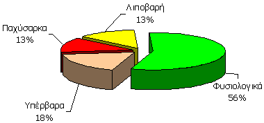 Ένα στα τρία παιδιά ηλικίας 3-12 ετών έχει υπερβάλλον σωματικό βάρος, ενώ το πρόβλημα του υπερβάλλοντος βάρους κορυφώνεται στις ηλικίες των 7-12 ετών και μάλιστα στις αγροτικές περιοχές, όπου το ποσοστό των υπέρβαρων και παχύσαρκων παιδιών φτάνει περίπου στο ένα στα δύο!!! Άξιο λόγου είναι επίσης το γεγονός ότι στη νηπιακή ηλικία των 3-6 ετών, 1 στα 5 παιδιά είναι λιποβαρές.