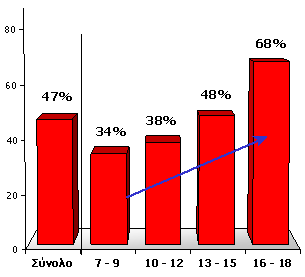 Το ποσοστό αυτό αυξάνει με την αύξηση της ηλικίας, και φτάνει στους νέους 16-18 ετών, σχεδόν στο 70%. Από την άλλη μεριά, ο χρόνος των καθιστικών δραστηριοτήτων (παρακολούθηση τηλεόρασης, παιχνίδια σε Η/Υ, κ.λπ.) πρέπει να περιορίζεται σε λιγότερες από 2 ώρες.