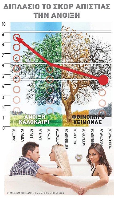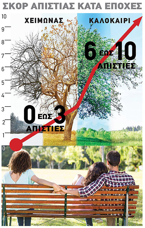 Η βαθμολόγηση της απιστίας είχε σκορ από 0 έως 10, ανάλογα με το πόσες φορές απίστησαν σε μια περίοδο έξη μηνών. Το σκορ απιστίας έδειξε πως η χειμερινή περίοδος κινήθηκε από 0 έως 3, ενώ η άνοιξη και το καλοκαίρι από 6 έως 10», μας λέει ο Δρ. Κωνσταντίνος Κωνσταντινίδης, χειρουργός ουρολόγος - ανδρολόγος, ιδρυτής και πρόεδρος του Ανδρολογικού Ινστιτούτου Αθηνών, του Dubai Center of Andrology και διευθυντής της Σεξουαλικής Κλινικής του Ιατρικού Κέντρου Αθηνών.
