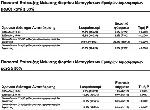 Στη μελέτη BELIEVE επετεύχθη το κύριο καταληκτικό σημείο της ερυθροειδούς ανταπόκρισης, το οποίο ορίστηκε ως μείωση κατά ≥33% στο φορτίο μετάγγισης ερυθρών αιμοσφαιρίων (RBC) (με μείωση ≥ 2 μονάδων RBC) κατά τις εβδομάδες 13-24 σε σύγκριση με το αρχικό διάστημα 12 εβδομάδων πριν από την τυχαιοποίηση. Η μελέτη περιλάμβανε επίσης δευτερεύοντα τελικά σημεία που αξιολόγησαν την επίδραση της θεραπείας στο φορτίο μετάγγισης ερυθρών αιμοσφαιρίων. Η μέση μεταβολή του φορτίου μετάγγισης από την έναρξη της μελέτης στις εβδομάδες 13-24 (με luspatercept έναντι εικονικού φαρμάκου) ήταν -1,35 μονάδες ερυθρών αιμοσφαιρίων.