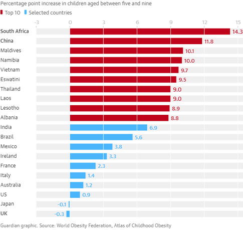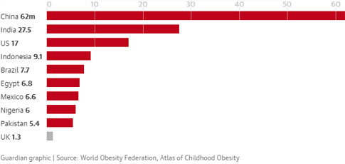 Θα υπάρχουν περίπου 62 εκατομμύρια παχύσαρκα παιδιά ηλικίας πέντε έως 19 ετών στην Κίνα έως το 2030, 27 εκατομμύρια στην Ινδία και 17 εκατομμύρια στις ΗΠΑ. Η παχυσαρκία καταστρέφει τις προοπτικές για την υγεία, τόσο για τους πλούσιους όσο και για τους φτωχούς. Η Λαϊκή Δημοκρατία του Κονγκό θα έχει 2,4 εκατομμύρια παιδιά με παχυσαρκία, ενώ η Τανζανία και το Βιετνάμ θα έχουν 2 εκατομμύρια. (πίνακας 2).