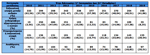 Κατά το πρώτο δεκάμηνο του 2019, έχουν καταγραφεί 473 περιστατικά HIV λοίμωξης, εκ των οποίων τα 364 αφορούν άνδρες και τα 106 γυναίκες.