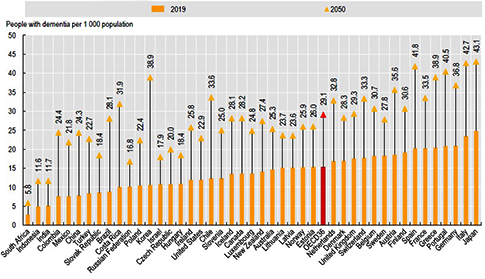 Οι εμπειρογνώμονες του ΟΟΣΑ συνδέουν άμεσα την επίπτωση της άνοιας με τη γήρανση του πληθυσμού. Η Ελλάδα, μαζί με την Ιταλία, την Πορτογαλία, την Κορέα και την Ιαπωνία θα έχουν, έως το 2050, αύξηση κατά το ένα τρίτο των ατόμων ηλικίας άνω των 65 ετών.