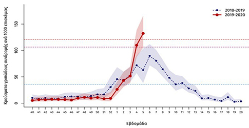 Σύμφωνα με το επιδημιολογικό δελτίο του Εθνικού Οργανισμού Δημόσιας Υγείας (ΕΟΔΥ), το 12,5% των επισκέψεων σε γιατρούς αφορά ασθενείς με συμπτώματα "γριπώδους συνδρομής", έναντι 10% την προηγούμενη εβδομάδα (γραφημα πιο κάτω). Στις ηλικίες έως 14 ετών, το ποσοστό φτάνει στο 15%.