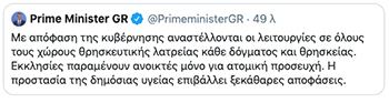 Λίγη ώρα αργότερα, με ανάρτησή του στο Twitter, ο πρωθυπουργός Κυριάκος Μητσοτάκης ανακοίνωσε ξεκάθαρα πως αναστέλλονται οι λειτουργίες σε όλους τους ναούς: