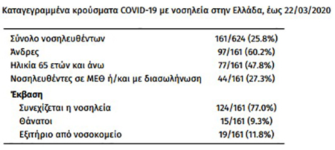 Συγκεκριμένα, από τα στοιχεία προκύπτει πως, μέχρι χθες, είχαν νοσηλευθεί συνολικά στη χώρα μας 161 ασθενείς, εκ των οποίων οι 44 σε μονάδα εντατικής θεραπείας (ΜΕΘ), με ή χωρίς διασωλήνωση (27,3%).
