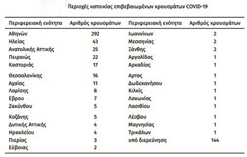 Στον παρακάτω πίνακα φαίνεται η κατανομή των κρουσμάτων σε ολόκληρη τη χώρα.