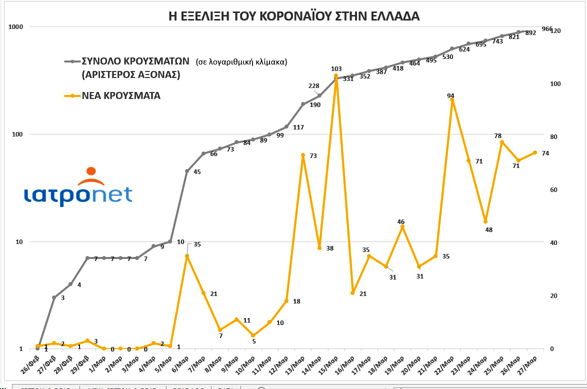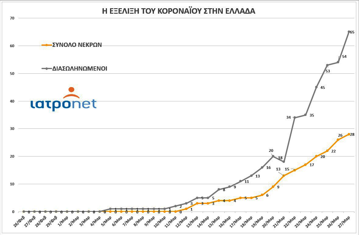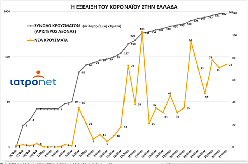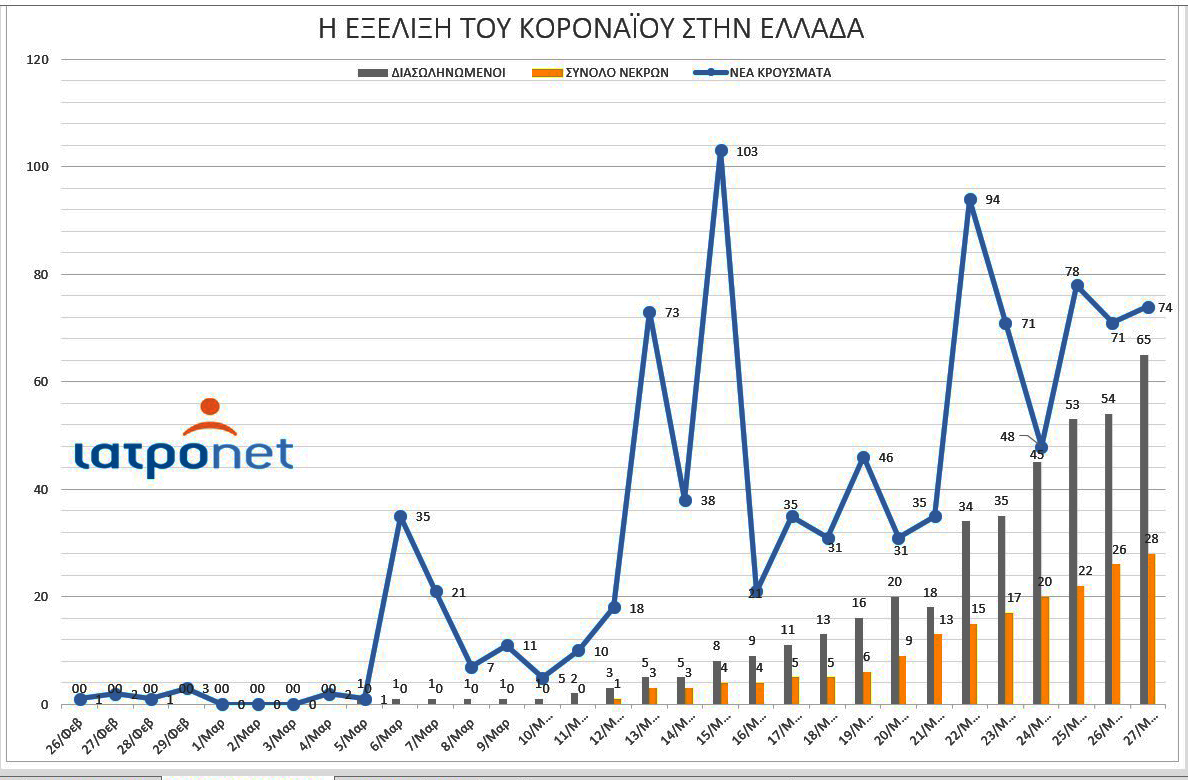 Το Iatronet παρουσιάζει μία σχηματοποιημένη εικόνα της επιδημίας του SARS-COV 2 στην Ελλάδα, από τη μέρα που καταγράφηκε το πρώτο κρούσμα, στις 26 Φεβρουαρίου, έως σήμερα, που ανακοινώθηκαν 74 νέες περιπτώσεις.