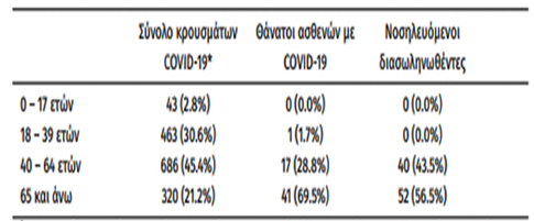Με το 21,2% των κρουσμάτων, οι άνω των 65 ετών εμφανίζουν το 69,5% των θανάτων (41 άτομα από τα 59 που έχουν συνολικά χάσει τη ζωή τους) και το 56,5% των διασωληνώσεων σε μονάδα εντατικής θεραπείας (52 από τα 92 του συνόλου).