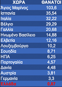 Στον Άγιο Μαρίνο αναλογούν 103,6 θάνατοι ανά 100.000 πληθυσμού, όταν στην Ισπανία αναλογούν 35,54 ανά 100.000 και στην Ιταλία 32,22.