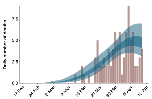 Οι καφέ μπάρες αναλογούν σε επιβεβαιωμένες περιπτώσεις λοίμωξης, οι μπλε ζώνες είναι οι εκτιμώμενες λοιμώξεις, με σκούρο μπλε 50% αξιόπιστο διάστημα και με ανοικτό μπλε 95% αξιόπιστο διάστημα. Ο αριθμός των ημερήσιων λοιμώξεων υποχωρεί αμέσως μετά από μια παρέμβαση που έχει γίνει από την Κυβέρνηση και εκτιμάται πως όλοι οι φορείς του ιού γίνονται αμέσως λιγότερο μολυσματικοί.
