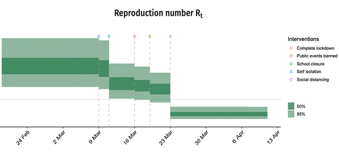 Ο δείκτης Rt αποτυπώνει τη μεταδοτικότητα κάθε φορέα. Εάν είναι πάνω από 1, ο αριθμός των λοιμώξεων θα αρχίσει να αυξάνεται ξανά. Στον παραπάνω πίνακα φαίνεται η επίδραση των μέτρων στη μεταδοτικότητα. Από αριστερά, το μπλε τρίγωνο αναφέρεται στο μέτρο της εθελούσιας απομόνωσης, ο πράσινος ρόμβος στο κλείσιμο των σχολείων, το μωβ τρίγωνο στα μέτρα κοινωνικής απόστασης, το πράσινο τετράγωνο αφορά την απαγόρευση δημοσίων εκδηλώσεων και ο κόκκινος κύκλος το lockdown.