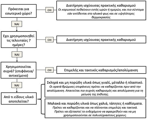Θα πρέπει να λαμβάνεται υπόψη ο τύπος της επιφάνειας και η συχνότητα χρήσης της. Προτεραιότητα στην απολύμανση πρέπει να δίνεται σε επιφάνειες που χρησιμοποιούνται συχνά.