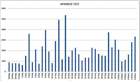 Ο ημερήσιος ρυθμός κυμαίνεται από 740 έως 4.917 εξετάσεις. Ο δεύτερος αριθμός αποτελεί ρεκόρ για τα δεδομένα της χώρας μας, το οποίο έχει καταγραφεί μία φορά: στις 14 Απριλίου.