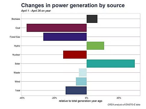 Το Ηνωμένο Βασίλειο (ΗΒ) δεν παρήγαγε ηλεκτρισμό από άνθρακα για δύο εβδομάδες τον Απρίλιο, ενώ η Πορτογαλία δεν χρησιμοποίησε άνθρακα για ολόκληρο τον μήνα, σημείωσε η CREA. Η Σουηδία απενεργοποίησε τον τελευταίο σταθμό παραγωγής ηλεκτρικής ενέργειας με καύση άνθρακα δύο χρόνια νωρίτερα από το χρονοδιάγραμμα, ακολουθούμενη από την Αυστρία, η οποία επίσης απαλλάχθηκε από άνθρακα.