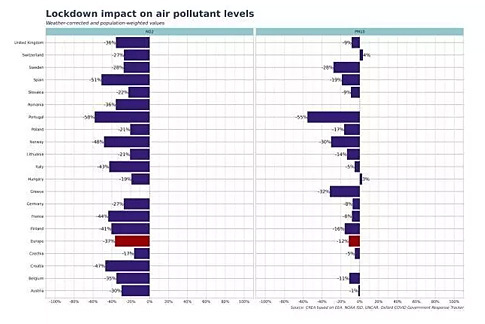 Το Κέντρο Έρευνας για την Ενέργεια και τον Καθαρό Αέρα (CREA), αναφέρει ότι τα επίπεδα του διοξειδίου του αζώτου (NO2) μειώθηκαν κατά 40% τον Απρίλιο και τα σωματίδια στην ατμόσφαιρα μειώθηκαν κατά 10% κατά την ίδια περίοδο.