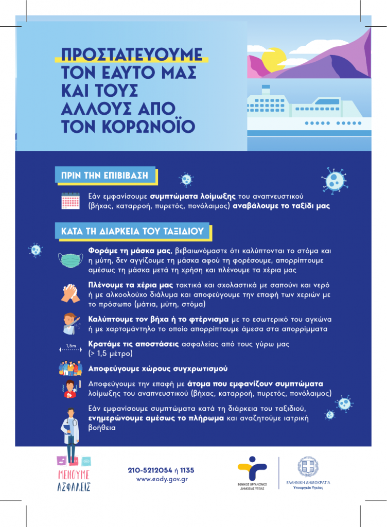 Συμβουλές για όσους πρόκειται να ταξιδέψουν με πλοίο, παρέχουν οι ειδικοί του Εθνικού Οργανισμού Δημόσιας Υγείας (ΕΟΔΥ).