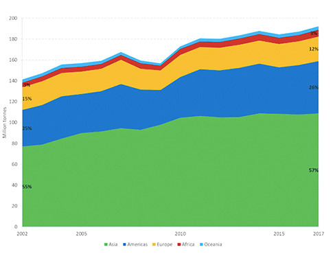 Οι παγκόσμιες εισροές αζώτου στα γεωργικά εδάφη από ανόργανα και χημικά συνθετικά λιπάσματα, σε εκατομμύρια τόνους, την περίοδο 2002 – 2017 παρουσιάζουν συνεχή αύξηση. Το 2017 στην Ασία καταγράφηκε το 57% της παγκόσμιας γεωργικής χρήσης χημικών λιπασμάτων (εκφραζόμενη σε N + P2O5 + K2O), στην Αμερική το 26%, στην Ευρώπη το 12%, στην Αφρική το 3% και στην Ωκεανία το 2%.