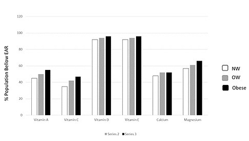 Μάλιστα, σύμφωνα πάντα με την ίδια μελέτη, ο παχύσαρκος, ο υπέρβαρος και ο φυσιολογικός πληθυσμός παρουσιάζουν παρόμοια επίπεδα ανεπάρκειας στην πρόσληψη απαραίτητων θρεπτικών συστατικών, κάτω δηλαδή από την Μέση Εκτιμώμενη Απαίτηση (EAR - Estimated Average Requirements).