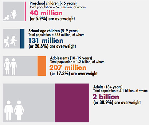 Το 5.9% των παιδιών προσχολικής ηλικίας (έως 5 ετών) παγκοσμίως είναι υπέρβαρα. Το ποσοστό αυτό εκτινάσσεται στο 20.6% στα παιδιά ηλικίας 5-9, μειώνεται ελαφρώς, στο 17.3% στους εφήβους και αυξάνεται δραματικά μετά την ενηλικίωση (18+) με το 38.9% του πληθυσμού να είναι υπέρβαρο.