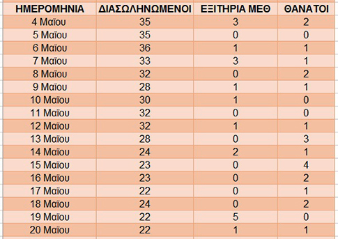 Από την άρση του "απαγορευτικού" (lockdown) στις 4 Μαΐου μέχρι και σήμερα, οι διασωληνωμένοι έχουν μειωθεί κατά 13 (ήταν 35 και έφτασαν 22), ενώ έχουν υπάρξει και 15 εξιτήρια ασθενών με CoViD-19 από τις ΜΕΘ (ήταν 81 και είναι 96).