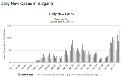 Στη χώρα των επτά εκατομμυρίων κατοίκων χθες έγινε γνωστό ότι εντοπίστηκαν 81 θετικά κρούσματα στα 2.371 τεστ που έγιναν συνολικά με τα περισσότερα εξ αυτών, 28 να βρίσκονται στη Σόφια. Νοσηλεύονται 314 ασθενείς, 17 εξ αυτών σε μονάδες εντατικής θεραπείας. Από το σύνολο των κρουσμάτων τα 341 αφορούν σε ιατρικό και νοσηλευτικό προσωπικό.