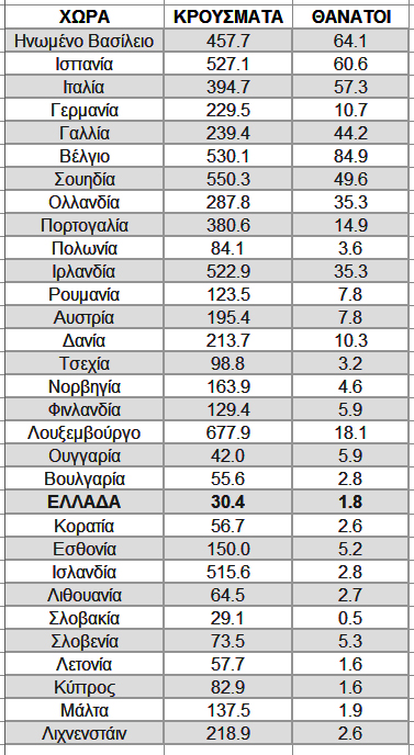 Ως προς τον αριθμό των θανάτων, υστερεί μόνο σε σχέση με τη Σλοβακία, τη Λετονία και την Κύπρο.