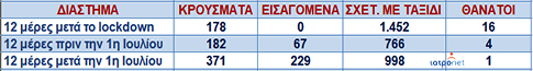 Το 12ήμερο που είχε προηγηθεί του ανοίγματος, δηλαδή από 18 έως 30 Ιουνίου, είχαν καταγραφεί 182 κρούσματα. Υπάρχει, δηλαδή, αύξηση 103,8%.