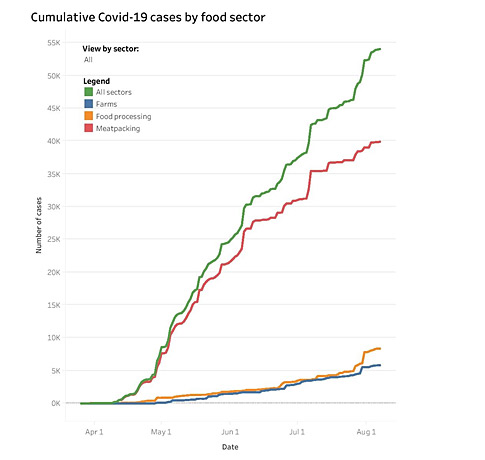 Στο διάγραμμα φαίνεται ο μεγαλύτερος κίνδυνος μετάδοσης του SARS-CoV-2 σε μονάδες επεξεργασίας κρέατος και πουλερικών.
