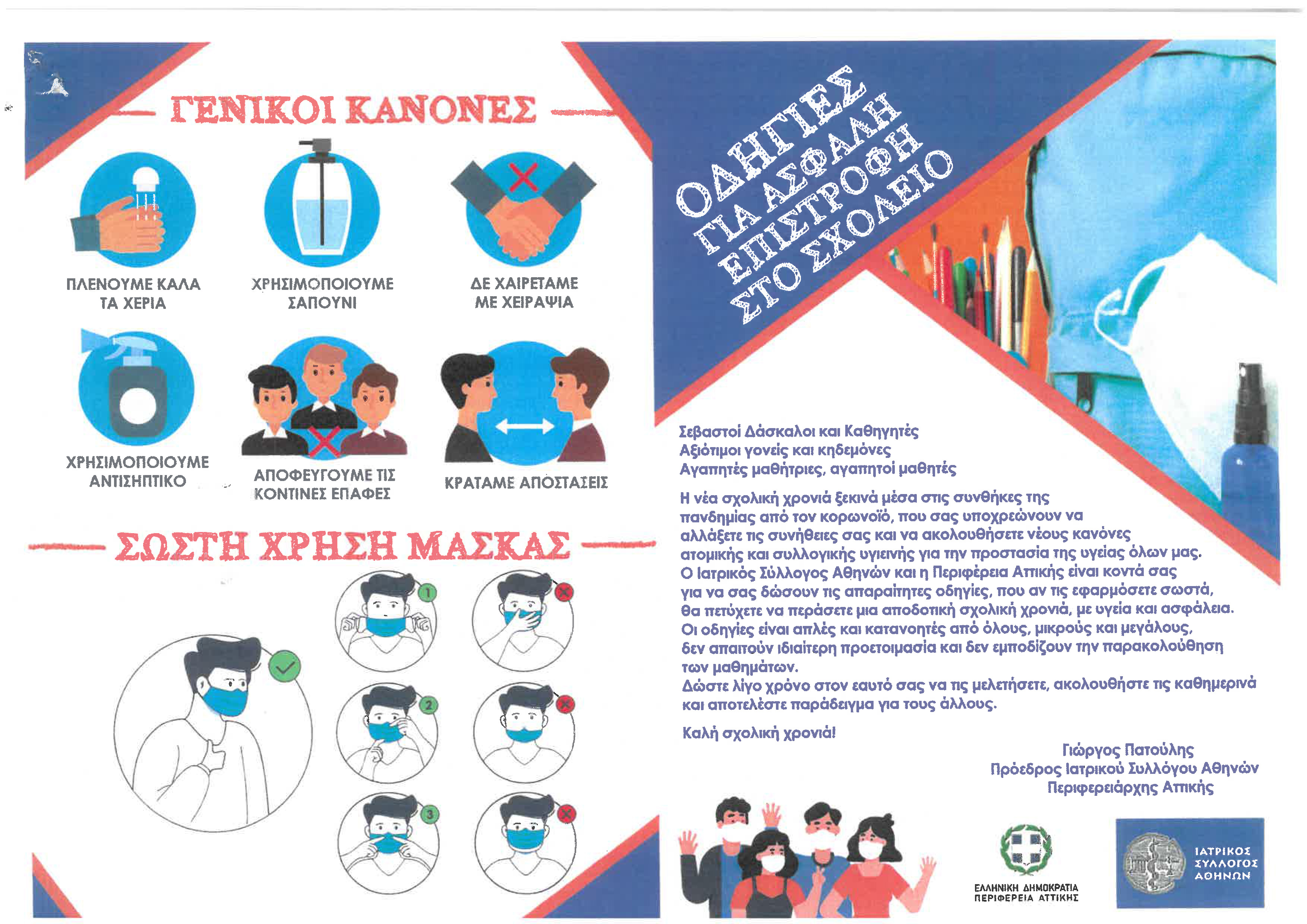 Στο φυλλάδιο, που παρατίθεται πιο κάτω, επισημαίνονται οι αρχές ατομικής υγιεινής και τα μέτρα πρόληψης στο σχολείο και κατά την επιστροφή από αυτό.