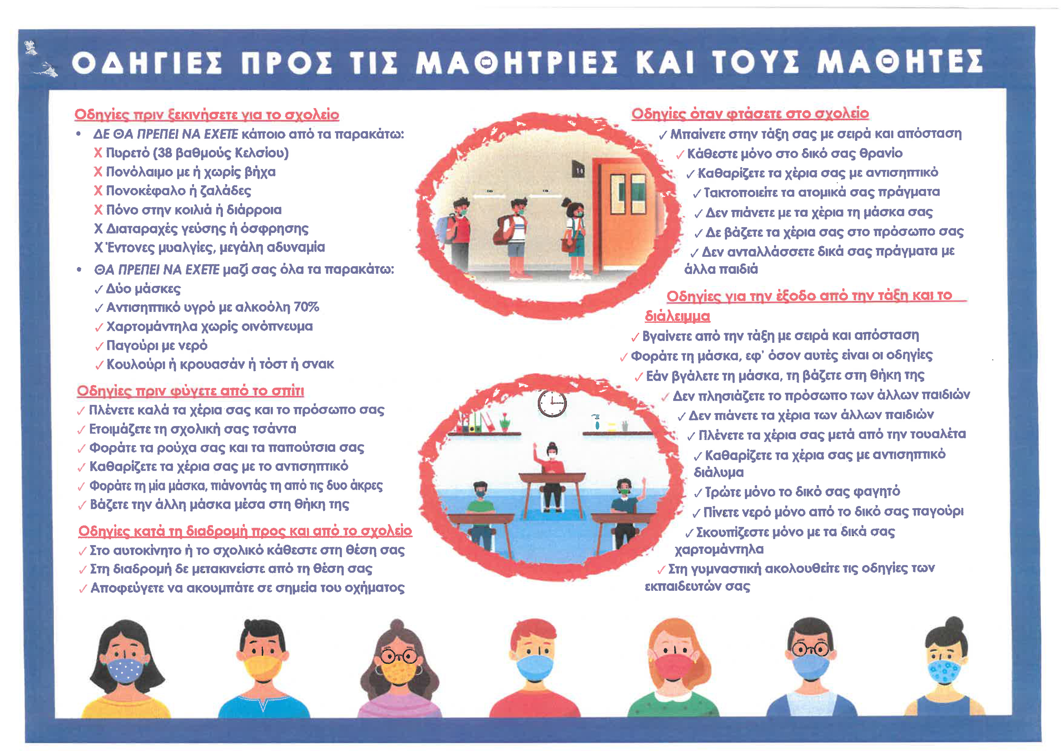 Παρέχονται, επίσης, οδηγίες για τι πρέπει να γίνεται πριν από την αναχώρηση για το σχολείο, κατά τη διαδρομή προς το σχολείο, στις σχολικές αίθουσες και στο διάλειμμα.