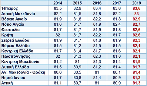 Όπως φαίνεται από τον πιο κάτω πίνακα, την χειρότερη επίδοση έχουν η Αττική και τα νησιά του Ιονίου (81,3 έτη), ενώ πολύ χαμηλά βρίσκεται και η Ανατολική Μακεδονία και Θράκη, με προσδόκιμο 81,4 ετών.