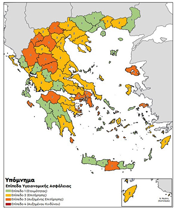 Ο χάρτης περιλαμβάνει τέσσερα επίπεδα προληπτικών μέτρων και κανόνων για κάθε Περιφερειακή Ενότητα της χώρας.