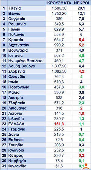 Ορισμένες ευρωπαϊκές χώρες, βιώνουν μία καταστροφική αύξηση στον αριθμό των νεκρών. Ενδεικτικές είναι οι περιπτώσεις της Τσεχίας, όπου αναλογούν 20,1 θάνατοι ανά 100.000 κατοίκους, έναντι 11 την περασμένη εβδομάδα!