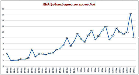 Στις 29 Οκτωβρίου, έσπασε για πρώτη φορά το φράγμα του 10%. Στις 7 Νοεμβρίου καταγράφηκε ποσοστό 31,5% στα Γρεβενά και 23,5% στην Πιερία, ενώ στις 10 Νοεμβρίου ο υπουργός Υγείας ανακοίνωσε θετικότητα 32% στη Θεσσαλονίκη.