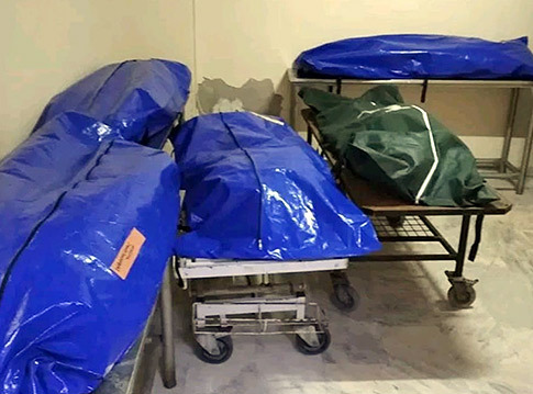 Σοροί ανθρώπων κλεισμένες σε μπλε πλαστικούς σάκους, τοποθετημένες εκτός ψυκτικών θαλάμων, σε χώρο που ψύχεται από ένα …air contition.