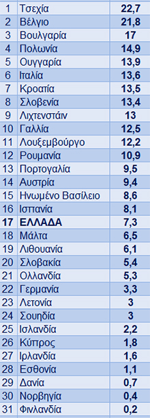 Με βάση το χθεσινό επιδημιολογικό δελτίο, η χώρα μας κατατάσσεται 17η μεταξύ 31 χωρών της Ευρωπαϊκής Ένωσης και το Ηνωμένο Βασίλειο, που συγκρίνονται στον σχετικό πίνακα.