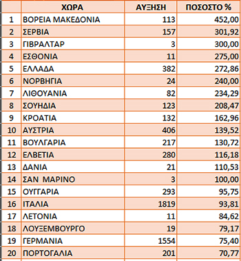 Στον παρακάτω πίνακα θα πρέπει να προσεχθεί ότι ορισμένες χώρες, όπως το Γιβραλτάρ και η Νορβηγία, η Δανία και το Σαν Μαρίνο εμφανίζουν μεν μεγάλα ποσοστά αύξησης, σε σχέση με το τέλος Οκτωβρίου, χωρίς όμως αυτό να μεταφράζεται σε απόλυτους αριθμούς, πιέζοντας το σύστημα Υγείας.