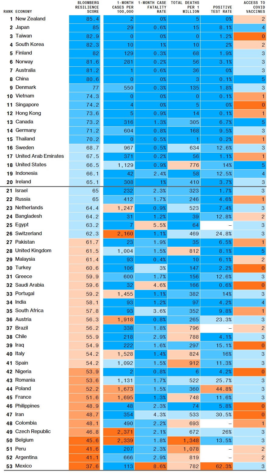 Οι οκτώ χώρες που βρίσκονται στην πρώτη δεκάδα είναι δημοκρατίες, το οποίο σύμφωνα με το Bloomberg καταδεικνύει ότι η επιτυχημένη αντιμετώπιση της Covid-19 με τη λιγότερη δυνατή οικονομική και κοινωνική διαταραχή βασίζεται λιγότερο στην καταπίεση και περισσότερο στην εμπιστοσύνη και την κοινωνική συμμόρφωση.