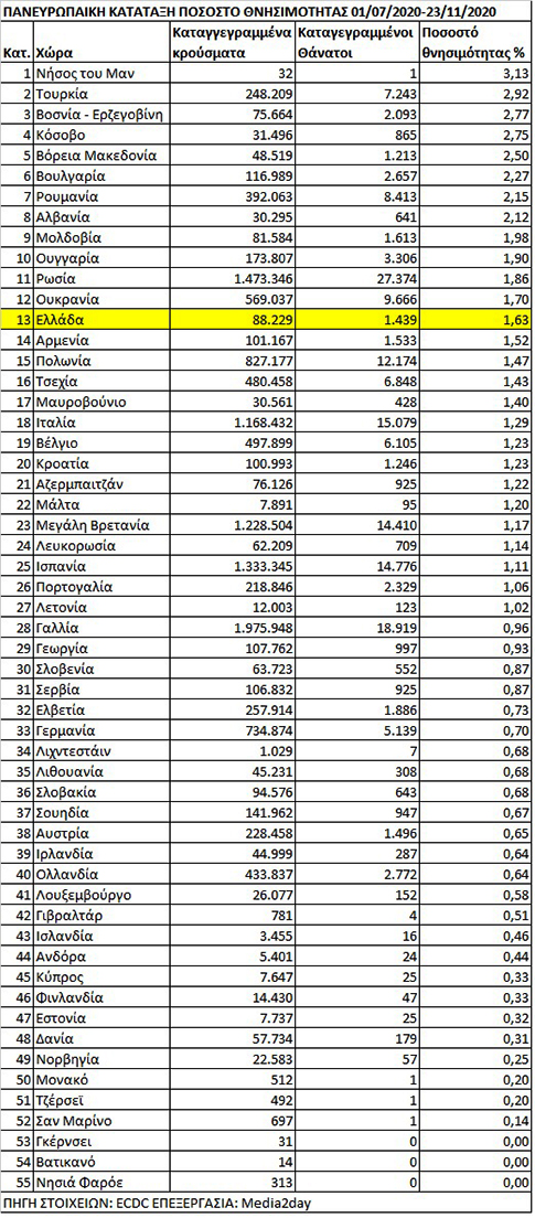 Την 4η θέση στην Ευρωπαϊκή Ενωση, σε ποσοστό πιστοποιημένων θανάτων, σε σχέση με τα επίσημα καταγεγραμμένα κρούσματα COVID-19, εμφανίζεται η χώρα μας, με ποσοστό 1,63%, σύμφωνα με τα στοιχεία της βάσης δεδομένων του Εuropean Center for Disease Prevention and Control ( ECDC) από την 1η Ιουλίου έως και την 23η Νοεμβρίου. Πανευρωπαϊκά, βρίσκεται στη 13η θέση μεταξύ 55 κρατών, κρατιδίων και αυτόνομων περιοχών.