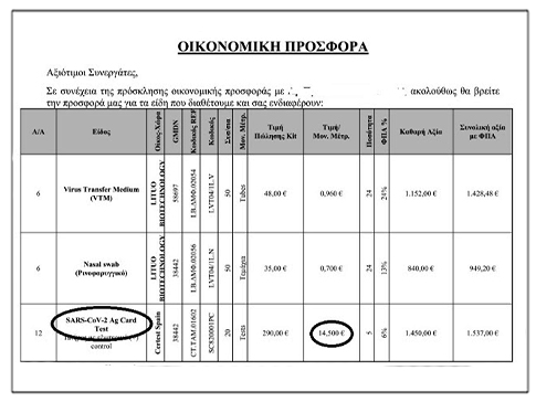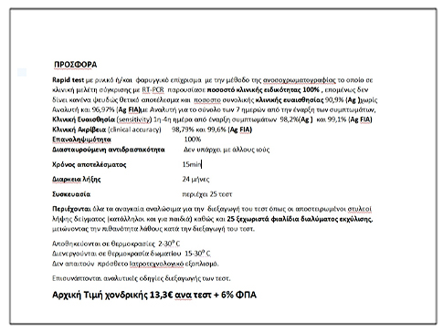 Οι γιατροί σημειώνουν πως ένα αξιόπιστο rapid test κοστολογείται (ανάλογα με τις ποσότητες) σε 7 έως 10 ευρώ συν 6% ΦΠΑ. Στον αντίποδα, ένα μη αξιόπιστο τεστ έχει τιμή 2 ευρώ + ΦΠΑ 6%.
