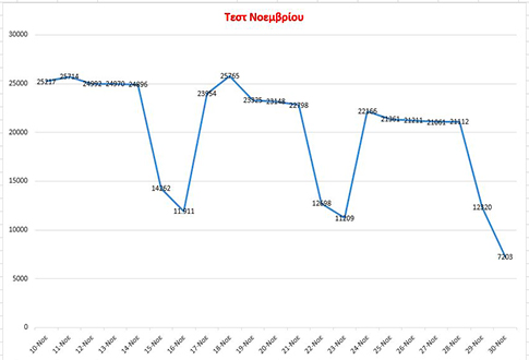 Από τον Οκτώβριο, ο ημερήσιος ρυθμός είχε σχεδόν σταθεροποιηθεί στα 25.000 τεστ. Υποχώρησαν σταδιακά στα 21.000. Την Κυριακή, έφτασαν στα 12.320 και χθες έκαναν αρνητικό ρεκόρ, με μόλις 7.203 τεστ.